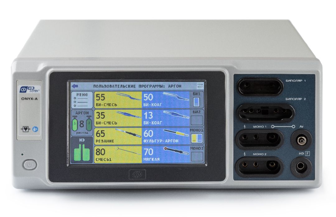 Интеллектуальная система ONYX-А открывает новое поколение электрохирургических аппаратов «ФОТЕК», оснащенных полным набором современных режимов резания и коагуляции, в том числе в среде аргона.